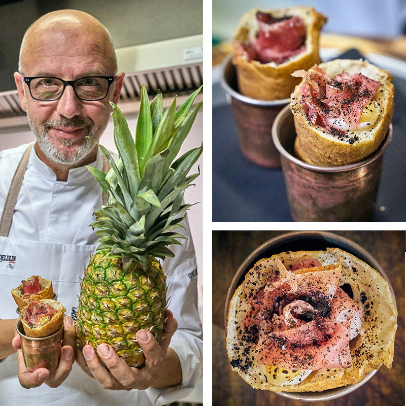 Sicuramente non caldo. Anzi ho voluto sfruttare proprio la freschezza dell’ananas, avvolgendolo nel prosciutto crudo San Daniele, sfruttandone la sua naturale sapidità e posizionandolo all’interno di un cono fritto dalle pareti “imbiancate” con della fonduta di Grana Padano DOP 12 mesi… il tutto spolverato con polvere di liquirizia.
