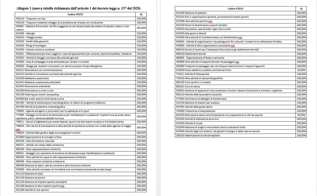Pubblichiamo tutti i codici Ateco delle aziende che avranno diritto ai sostegni del decreto Ristori in tutta Italia con le relative percentuali
