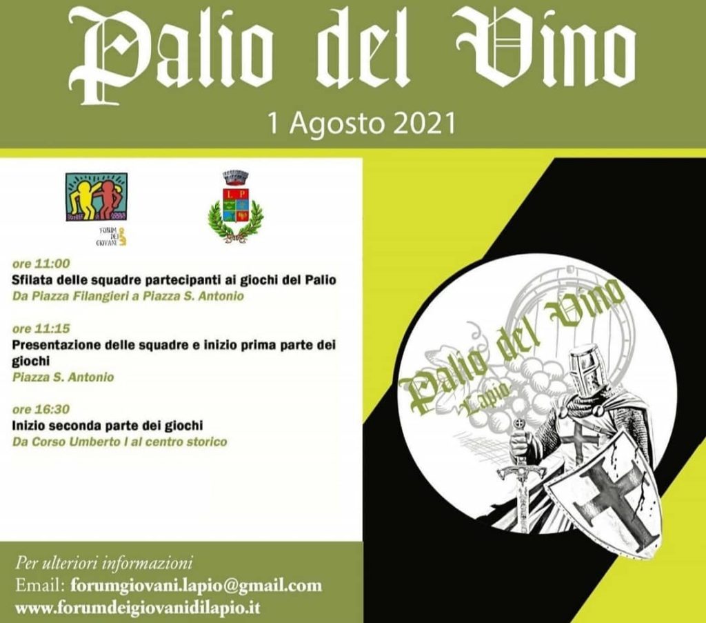 La manifestazione si terrà domenica 01 agosto 2021, tra i vicoli e le piazze di una delle capitali irpine delle uve pregiate.Evento all’insegna del divertimento, musica, giochi e molto altro. Un momento di aggregazione, capace di coinvolgere i giovani e l’intera comunità. Alle ore 11, sfileranno le compagini in gara, saranno presentate le squadre che parteciperanno al palio. Quindi spazio ai giochi in piazza Sant’Antonio, che si fanno omaggio alla Lapio medievale tra botti di vino, carri ed insidiosi percorsi. A partire dalle ore 16e30 i giochi saranno di scena in corso Umberto I per prolungarsi fino a sera, quando si decreterà la squadra vincitrice.