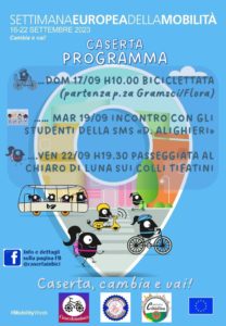 Si inizia domenica 17 settembre con una “classica” pedalata per le strade della città, con partenza ed arrivo a piazza Gramsci, nei pressi della Flora; il raduno è previsto per le 10, con partenza mezz’ora dopo; percorso interamente pianeggiante che toccherà il quartiere Acquaviva per poi rientrare nel centro storico. Si passerà pedalando anche di fianco alla Scuola Media Statale “Dante Alighieri” di viale Medaglie d’Oro, nel quale è previsto il secondo appuntamento della European Mobility Week casertana; martedì 19 settembre un gruppo di volontari delle tre associazioni incontreranno oltre duecento studenti delle classi terze, con i quali discuteranno del significato di “mobilità sostenibile” e dell’idea di coinvolgere la loro scuola in una sperimentazione di “bicibus”, ossia la versione in bicicletta del già affermato “piedibus”. Terzo ed ultimo evento venerdì 22 settembre, in coincidenza conla “Giornata Europea Senz’Auto”, quando da Casolla (appuntamento al tramonto fuori Caffè Italia di via F. De Renzis) si camminerà lungo la pedemontana toccando i suggestivi siti di San Rufo e San Pietro ad Montes. Ulteriori dettagli ed informazioni saranno resi noti dagli organizzatori con successivi comunicati e con aggiornamenti sulle