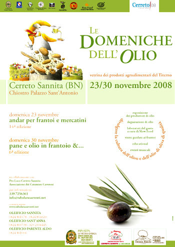 Dal Friuli alla Sicilia, da Siena Imperia a Cerreto Sannita, ecco che domenica 30 novembre tutto lo stivale torna a festeggiare l’olio extravergine d’oliva con “Pane e Olio in Frantoio &…”. La manifestazione, organizzata dall’Associazione Nazionale Città dell’Olio, giunge alla sua settima edizione e si presenta nelle Città dell’Olio di tutta Italia con programmi di degustazioni, visite guidate a frantoi e oliveti, rievocazioni dei riti di raccolta e molitura oltre ai banchi d’assaggio.