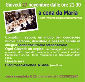 A cena da Maria (tutti insieme appassionatamente). L’Ex Libris di Palazzo Lanza di Capua che della socialità e dell’incontro intorno ad una passione comune ne ha fatto una bandiera, con i numerosi appuntamenti con la letteratura, il teatro, il cinema, la musica, ha pensato bene di dedicare la serata del giovedì a quelle persone che attraverso la buona tavola possono avere la possibilità di conoscere nuova gente.