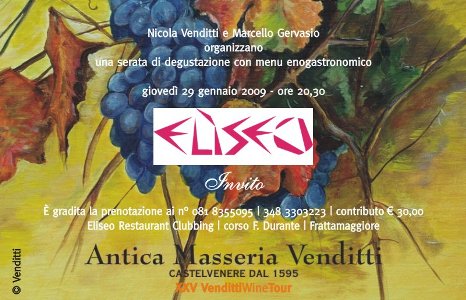 Giovedì 29 gennaio 2009 ale ore 20,30, presso “Eliseo restaurant clubbing” in Via F. Durante a Frattamaggiore (Na), si terrà la XV edizione del VendittiWineTour. La manifestazione ideata e realizzata dall’enologo Nicola Venditti, titolare dell’Antica Masseria Venditti, insieme ai migliori ristoratori, giunta alla XXV tappa, intende promuovere la migliore ristorazione dove sono presenti i vini doc e biologici di Venditti. Lo storico teatro di Frattamaggiore risorge nell’Eliseo Restaurant Clubbing, sul corso F. Durante. La città di Frattamaggiore oggi è uno dei centri più importanti dell’hinterland napoletano. Ha saputo cambiare la sua economia, modernizzando i suoi servizi ed ha esteso la sua configurazione urbana, alla continua ricerca di nuove soluzionie tendenze. L’Eliseo Restaurant Clubbing risponde appieno a queste esigenze. La sua struttura sviluppata su due livelli si estende su una superficie che sfiora i 700 mq. E’ una una consolidata realtà, sicuramente un bel fiore all’occhiello di tutta la città.