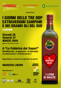 Giovedì 26 e venerdì 27 marzo 2009, dalle ore 18:30 alle ore 23:00, a Battipaglia, presso “La Fabbrica dei Sapori…” si svolgerà la II edizione de “I giorni delle tre DOP extravergini campane e dei grandi oli del Sud”.