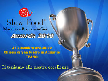 Lunedì 27 dicembre 2010 alle ore 19.00, nella suggestiva cornice della chiesa di San Pietro in Aquariis a Teano, Slow Food Massico e Roccamonfina celebra le realtà del territorio che nel 2010 hanno meritato di essere incluse nelle guide Slow Food. “Festeggiamo con loro – spiega Giuseppe Orefice – perché i loro successi sono il segno evidente che uno sviluppo sostenibile, attento e rispettoso della cultura locale è possibile”.