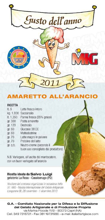 In occasione della presentazione della nuova campagna pubblicitaria, il Comitato nazionale per la difesa e la diffusione del gelato artigianale di produzione propria (G.A.) e Longarone Fiere, hanno presentato in anteprima la ricetta originale di Amaretto all’Arancio ed il logo ufficiale che caratterizzerà il Gusto dell’Anno, eletto alla MIG dagli oltre 100 esperti della Giuria di qualità, rendendolo riconoscibile all’interno delle gelaterie artigianali.