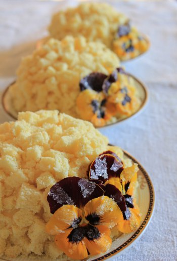 Prima di tutto raccogliete dal vostro balcone delle pansè del colore che più vi piace. Io ho scelto delle viole giallo-marrone perchè mi sembrano più in armonia con le tortine. Preparate in una ciotolina un albume d’uovo che va leggermente sbattuto per slegarlo, e dello zucchero (preferitene uno non troppo fine) in un piattino. Con un pennellino mettete un po’ di albume sui petali; non ricoprite tutto il petalo altrimenti l’effetto non vi piacerà. Premete poi leggermente i fiori nello zucchero. I granelli resteranno attaccati solo dove avrete passato l’albume. Mettete ad asciugare su della carta forno.