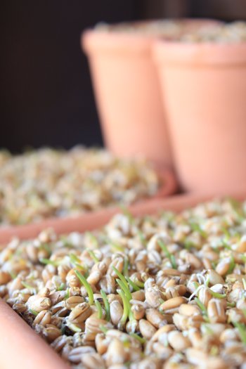 Tenete il grano in un recipiente con acqua tiepida per qualche ora e nel frattempo scegliete dei recipienti in cui vi piacerebbe che il vostro grano germogliasse. Vassoi bassi e sottovasi sono perfetti. Ricoprite con dell’ovatta o un po’ di terra. Io mi ritrovavo della torba, che mi è sembrata ottima per farvi aggrappare le radichette del grano… Infine spargete i chicchi in maniera uniforme senza né lasciare vuoti nè facendoli accavallare troppo.