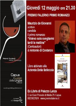 Giovedì 12 Maggio sarà la volta dello scrittore Maurizio De Giovanni che candida al premio il libro “Volevo solo svegliarmi tardi la mattina” (Centoautori) di Antonio di Costanzo abbinato al Falerno dell’Azienda Della Sellecola.