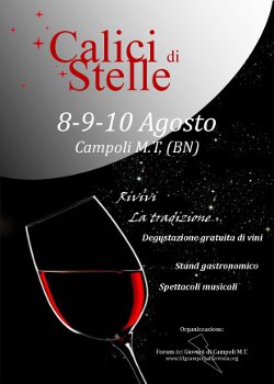 Il Forum dei Giovani di Campoli da sempre si onora di organizzare la manifestazione che maggiormente promuove i prodotti agricoli e della tradizione del territorio sannita. “Calici di Stelle” è una manifestazione a carattere nazionale, che rientra nel circuito di Città del Vino. L’edizione Sannita ha luogo a Campoli del Monte Taburno dall’8 di Agosto fino al 10, giorno di San Lorenzo. L’evento è una vera e propria vetrina enogastronomica che affascina i tantissimi visitatori giunti nel piccolo paese ai piedi del Monte Taburno da ogni angolo della regione e non solo. Le tre serate sono accompagnate da spettacoli musicali, ballo liscio, musica popolare e attrattive di vario genere che coinvolgono ogni singola fascia di età. Al centro dell’attenzione il re dei prodotti agricoli sanniti, il Vino.