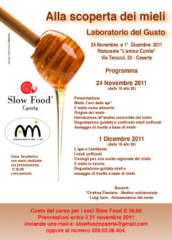 “Alla scoperta dei mieli” è il laboratorio del gusto, organizzato dalla Condotta Slow Food di Caserta in collaborazione con l’Associazione Ambasciatori dei Mieli, che si svolgerà il 24 Novembre e il 1° Dicembre presso il ristorante “L’Antico Cortile” ,Via Tanucci, 53 – Caserta.
