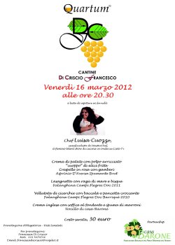 Dopo la sua brillante performance a MasterChef, il seguito talent show culinario andato in onda su Cielo Tv che l’ha vista arrivare al secondo posto tra 18 agguerriti aspiranti cuochi, Venerdì 16 Marzo (ore 20,30) Luisa Cuozzo approda ai fornelli del Quartum Store di Quarto (Na) per dare vita a un’intrigante cena in cantina.