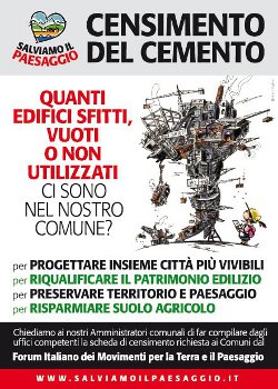 Nel corso della conferenza stampa sarà presentata la prima campagna nazionale del Forum “Salviamo il Paesaggio, difendiamo i Territori” con la proposta di un censimento capillare, in ogni comune italiano, per mettere in luce quante abitazioni e quanti edifici produttivi siano costruiti ma non utilizzati, vuoti o sfitti.
