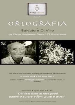 Si inaugura mercoledì 4 aprile – alle 19.30 -, presso l’osteria “Vintage e cucina” al civico 3 di via Santa Marta ad Aversa, la mostra fotografica di Salvatore Di Vilio dal titolo: “Ortografia”. Diciotto dittici che ritraggono volti e prodotti della terra, immagini dall’orto sociale del casale di Teverolaccio di Succivo che raccontano il riscatto dei luoghi e delle persone che si riappropriano dei posti, che scelgono di farli rivivere e rifiorire. E nel gioco dell’attesa e della velocità si innesta il tema gastronomico per la serata inaugurale: “Dal fast food al fast good – panini d’autore buoni, puliti e giusti”. La scelta di prodotti di piccoli e coraggiosi artigiani del gusto, verdure di stagione e vini del territorio perché non sempre il pasto veloce è sinonimo di cibo spazzatura, ma può essere declinato in varianti gustose e sane. Le immagini di “Ortografia” rimarranno esposte all’osteria “Vintage e cucina” fino al 20 aprile (info: 345 44 27 756).