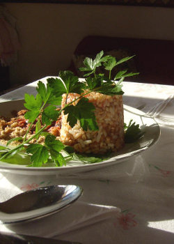 Impiattare capovolgendo lo stampino, completare il piatto con poco pangrattato abbrustolito in padella e cosparso di sugo, aggiungere un filo d’olio Carli.