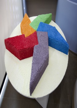 Il dolce gigante, che riproduce il logo del polo commerciale, una girandola stilizzata a cinque punte con i colori dell’iride, è un pandispagna che alterna crema chantilly e cioccolato al gianduia con fragoline fresche di bosco e un leggero gusto al limone: spesso 35 centimetri, per realizzarlo sono stati impiegati un quintale e mezzo di farina, 480 uova fresche, 70 chili di zucchero, 60 litri di latte e 5 chili di fecola.