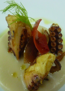 Raviolo di cernia con clorofilla di zucchine e lumachine di mare