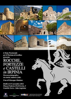 Dal 6 al 13 novembre 2012, per iniziativa dell’EPT di Avellino, sarà esposta a Bari, presso la   Sala Angioina del Castello Svevo la mostra fotografica “Rocche, Fortezze e Castelli in Irpinia” immagini come appunti di viaggio. Percorso fotografico tra storia, natura e fede. Le pregevoli foto sono state realizzate da Giuseppe Ottaiano. In Irpinia i siti di incastellamento costituiscono un patrimonio inestimabile: oltre 70 tra manieri, torri e borghi fortificati, dislocati su una superficie di appena 2.791 Kmq. La Mostra fotografica – che rientra nell’ambito di un progetto di promozione extra regionale delle Terre d’Irpinia – presenta al pubblico una selezione delle oltre 120 immagini che compongono un ampio reportage fotografico, il cui obiettivo è quello di proporre i manieri irpini in qualità di forti attrattori turistici, tramite privilegiato tra il territorio e il visitatore. Attraverso le vicende che lungo i secoli hanno interessato i Castelli, si svelano infatti anche tutte le altre preziose risorse dell’Irpinia: arte, cultura e tradizioni, senza dimenticare le tipicità eno-gastronomiche locali, che potranno essere degustate durante la cerimonia di inaugurazione che si terrà  martedì 6 novembre alle ore 12 presso la Sala Angioina del Castello Svevo di Bari.