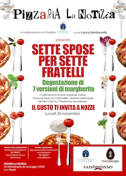 La margherita come non l’avete mai vista, in sette versioni diverse proposte in un’unica serata! Tutto questo il 26 novembre alle ore 20,00 alla PizzAria La Notizia di via Caravaggio,53 a Napoli in occasione di “Sette spose per sette fratelli”, l’originale serata interamente dedicata alla regina delle pizze che il maestro pizzaiolo Enzo Coccia ha organizzato in collaborazione col birrificio marchigiano Collesi e con la giornalista enogastronomica Laura Gambacorta.