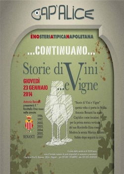 Il ciclo di incontri “Storie di vini e vigne “ all’enosteriatipicanapoletana Cap’alice il 23 gennaio ospiterà la prima verticale storica dell’Etna rosso Rovittello di Benanti. Antonio Benanti racconta la storia dell’azienda di famiglia affiancato da Marina Alaimo, collaboratrice per la guida Slow Wine, nella degustazione delle sette annate: 1996, 97, 2002, 03, 04, 05, 07. I vini dell’Etna sono molto apprezzati in tutta Italia e all’estero per il carattere marcatamente territoriale che sanno esprimere. L’azienda è dedita alla vitivinicoltura sul vulcano da circa venticinque anni, anche se in famiglia si è sempre fatto vino. Il suolo vulcanico e le spinte altitudini rendono particolarmente interessanti i vini dell’Etna che sanno esprimersi al massimo della qualità sia nella produzione di bianchi, da uve carricante, che rossi, da nerello cappuccio e nerello mascalese. A Viagrande, nella zona più vocata per la vitivinicolatura, la famiglia Benanti possiede venti ettari di vigneto nel quale sono protagonisti soprattutto i vecchi alberelli, tipici di quest’area. Rovittello è un rosso di grande personalità, da lungo invecchiamento, al quale il nerello cappuccio, allevato a 900 metri di altitudine, conferisce grandi profumi, struttura e timbro tannico; mentre il nerello cappuccio tinge il colore e stempra gli eccessi spigolosi. Il resto sarà interessante sentirlo raccontare da Antonio, ritornato alle radici vitivinicole di famiglia dopo un lungo periodo di studi e lavoro all’estero.