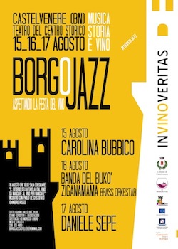 “BORGOJAZZ. Aspettando la Festa del Vino” è una rassegna musicale che si svolge a Castelvenere (BN), nel centro storico del paese, il 15/16/17 agosto 2014. L’evento si inserisce nel progetto più ampio di “In Vino Veritas” che prevede sei eventi, legati al vino, in sei borghi del Sannio e il cui comune capofila è Torrecuso, un intervento finanziato dalla Regione Campania realizzato con il cofinanziamento dell’Unione Europea POR Campania FESR 2007-2013 asse 1 Ob Op 1.12 “ La Scoperta della Campania .