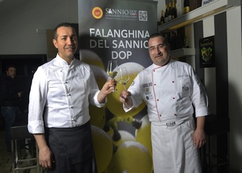 _CIT1211Si archivia con successo la seconda tappa proposta dal progetto ‘Pizza e Falanghina: un incontro di gusto’ proposto dal Sannio Consorzio Tutela Vini con la compartecipazione della Camera di Commercio di Benevento, attraverso l’azienda speciale Valisannio. Giornalisti e operatori del settore hanno partecipato alla prima uscita fuori dai confini sanniti del viaggio in compagnia della Falanghina del Sannio con la Vera pizza napoletana Stg (Specialità tradizionale garantita). La serata è stata ospitata nell’accogliente struttura di Palazzo Vialdo, a Torre del Greco. A fare gli onori di casa il patron Vincenzo Di Prisco; protagonisti il pizzaiolo della struttura torrese, Gianfranco Iervolino, e il dinamico Gino Sorbillo, nel ruolo di testimonial della campagna promozionale della Falanghina del Sannio. In apertura, proprio Iervolino e Sorbillo hanno evidenziato la capacità dei vini Falanghina a sposare il piatto della tradizione napoletana, in tutte le sue varianti. In risalto, infatti, l’eclettismo a tavola dei calici ottenuti dal vitigno più rappresentativo della Campania. Vini capaci di reggere il confronto con le preparazioni più svariate, come confermato dal connubio perfetto emerso a tavola tra le diverse tipologie di Falanghina e le pizze proposte da Iervolino e Sorbino: dalla ‘Pizza fritta’ (un classico di Sorbillo) alla ‘Pizza napoletana con alici di Cetara’, passando tra la tradizione della ‘Pizza Margherita’, le incursioni innovative della ‘Pizza che cavolo vuoi con gambero di Mazzara fresco’ e la sapiente rivisitazione proposta nella ‘Pizza con carciofi e patate arrecanate’. Dopo la tappa in terra partenopea, ‘Pizza e Falanghina’ si prepara alla trasferta milanese, con la serata riservata ai giornalisti in programma, venerdì 20 marzo (dalle ore 18.30 alle ore 20), a ‘Lievito madre al Duomo’, con Gino Sorbillo che ospiterà la rassegna nel suo locale in largo Corsia dei Servi, aperto nell’ottobre scorso e già diventato uno dei luoghi imperdibili della città lombarda, come recensito recentemente dal prestigioso New York Times.
