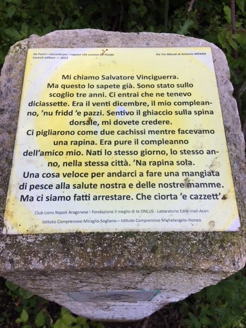 Gia’ superando il pontile è stato possibile immergersi in una natura straordinaria con i tornanti avvolti da stormi di gabbiani in una natura incontaminata. La visita allo showroom di manufatti artistici è stata una piacevole sorpresa, infatti, con oggetti realizzati nel laboratorio di ceramica dai giovani del penitenziario minorile nell’ambito dei progetti filantropici della Cooperativa sociale Nesis, è possibile dare un contributo al riscatto sociale dei ragazzi ed incoraggiare le attività della cooperativa con il marchio Nciarmato a Nisida . Aveva qui la sua villa Bruto il cesaricida, fu riserva di caccia e poi carcere durante il periodo borbonico. Grazie alla determinazione e ad un lungo e duro lavoro della direzione dell’Istituto Penale Minorile di Nisida ed, in particolare, della prof.a Maria Franco che ivi insegna, a conclusione del progetto “Le ali al futuro” si costituì il Parco Letterario e la riapertura di alcuni dei suggestivi sentieri che percorrono l’isola, come quello dedicato ad Omero, forse il primo dei tanti poeti, scrittori, musicisti che hanno scritto della “piccola isola” (Nisida, dal greco “nesis” = piccola isola). Tutte le info per sostenere la coop su www.nesiscoop.it