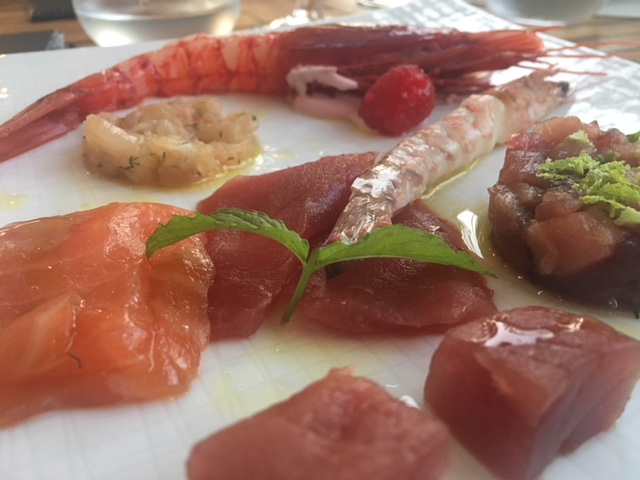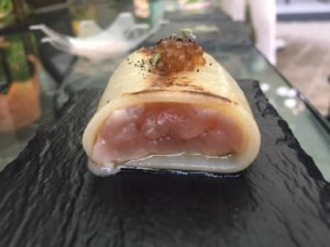 Nel piatto anche Mazzancolle, Gambero Viola che è l’unica varietà di gambero servita, senza spazi per incursioni d’oltreoceano, tonno rosso, tartare di tonno derivata dalla pancia del pesce, cubotto con il dorso del tonno e un sashimi di tonno rosso, salmone marinato a secco con zucchero mascobado ( il vero zucchero di canna grezzo), tartare di ombrina e maionese frutti di bosco , una fragolina la troviamo anche nell’alice marinata a seguire, una fragola raccolta a 30 mt dal ristorante. In abbinamento Puro Verdeca Salento bianco Igp 2017 Tenuta Marano, ottimo vino, ma su tale cruditè credo il gusto imponesse una intensità maggiore, magari quella di una falanghina dei Campi Flegrei.