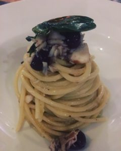 Con il primo siamo andati al punto più meridionale del mar Tirreno, ecco il Cappero di Salina sullo Spaghettone ‘’Pastai Gragnanesi’’ alla buonadonna con ricciola ( mai può mancare una ricciola nel menù di mare nel napoletano) e olive nere di Gaeta, vino giustamente servito il None Negroamaro Rosato 2017 Tenuta Marano.