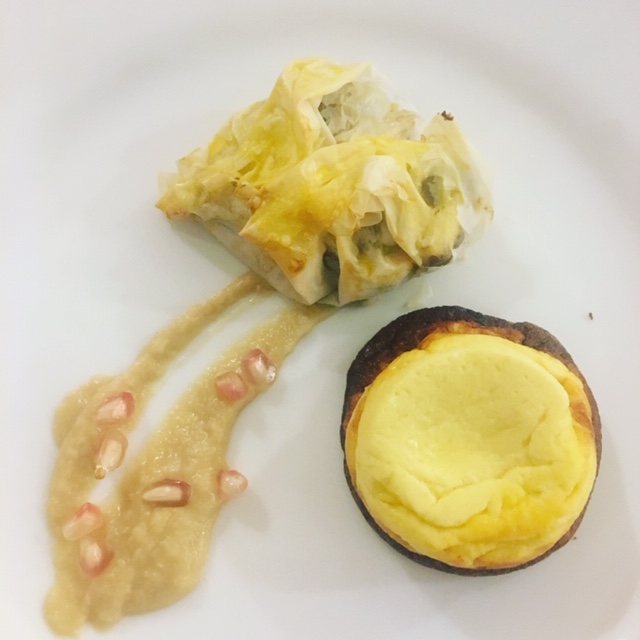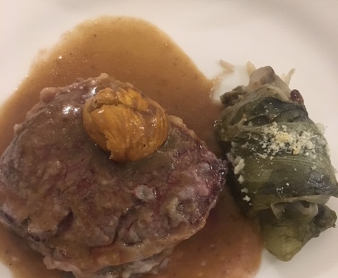 A Castello Ducale per la serata di inizio ottobre, cucina ricercata nella stagionalità di territorio prettamente campano, con budino di caciocavallo del Matese con crema di ceci, Fagotto di pasta fillo con porcini e mozzarella di bufala campana dop, fusilli avellinesi con frutta secca e tartufo, filetto di vitello lardellato con castagne e rotolo di scarola, una semplice millefoglie scomposta.