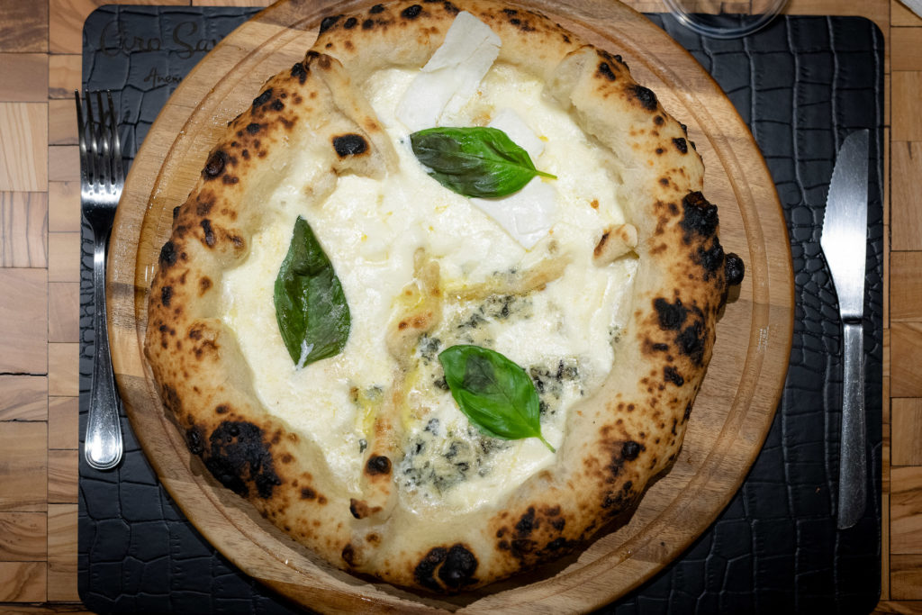 Quattro prodotti caseari campani d’eccellenza ottenuti da specie diverse per rilanciare in grande stile la pizza ai Quattro formaggi, un classico della tradizione italiana troppo spesso mortificato a causa dell’impiego di materie prime mediocri. L’idea è di Ciro Savarese, pizzaiolo-patron dell’omonima pizzeria di Arzano fresca di restyling (in precedenza si chiamava Anema & Pizza), che con la sua “Quattro Latti campana” vuole ridare lustro a questa amata pizza bianca. A ricoprire il leggerissimo disco di pasta di Savarese sono fior di latte di Agerola, blu di bufala, cacioricotta del Cilento e conciato romano rispettivamente ottenuti con latte di vacca, bufala, capra e pecora. La Quattro Latti campana è solo la protagonista principale del nuovissimo menu di Savarese, tutto caratterizzato da un largo impiego di prodotti altamente selezionati.