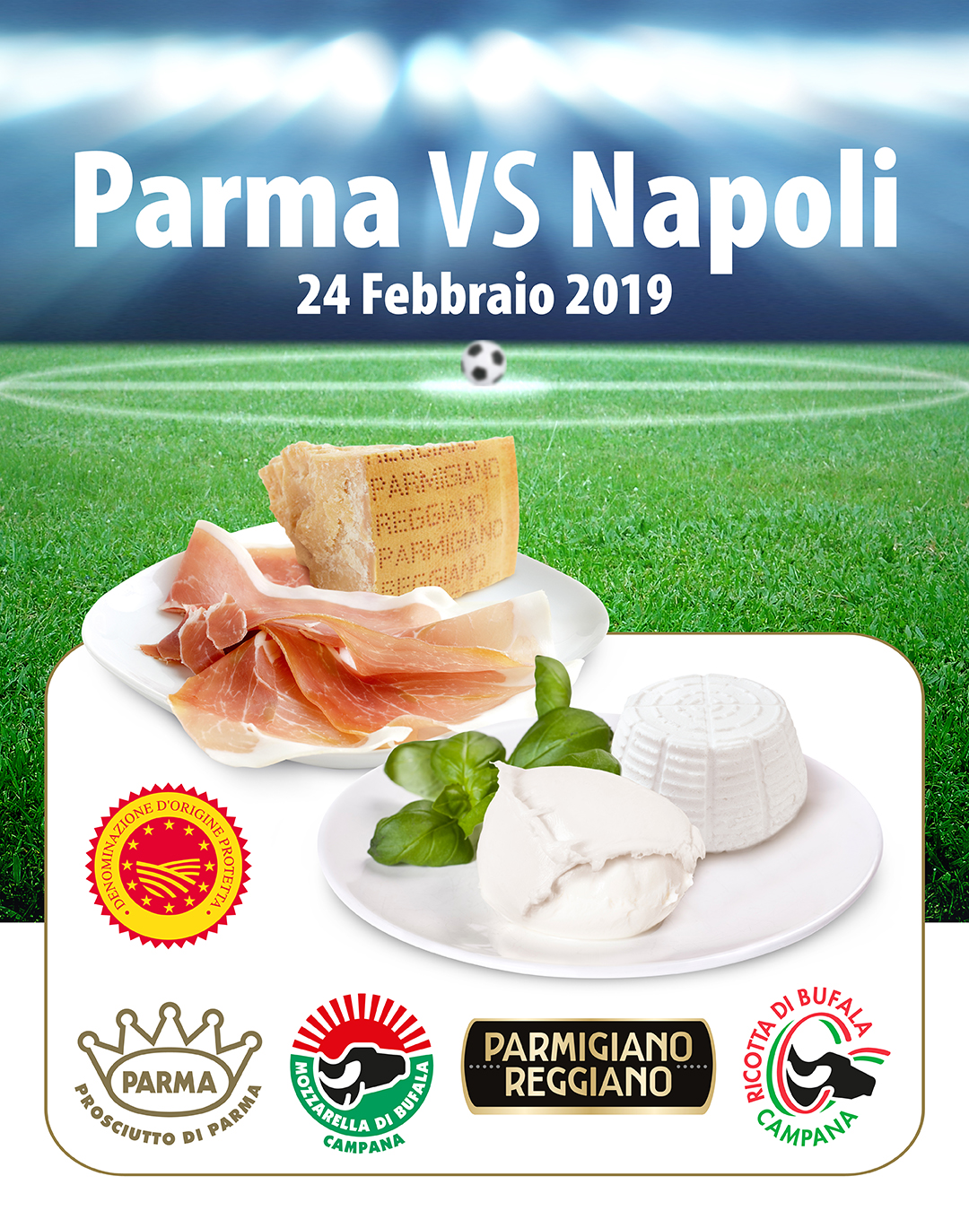 La partita di campionato Parma-Napoli in programma domenica 24 febbraio sarà anche un derby del gusto Dop. Allo stadio “Tardini” si giocherà una doppia sfida: l’una sportiva e l’altra gastronomica tra i prodotti di eccellenza sull’ asse Campania-Emilia Romagna, a latere del terreno di gioco.In campo la Mozzarella di Bufala Campana Dop, la Ricotta di Bufala Campana Dop,il Prosciutto di Parma Dop e il Parmigiano Reggiano Dop con i rispettivi Consorzi di Tutela per un match all’ ultima fetta.