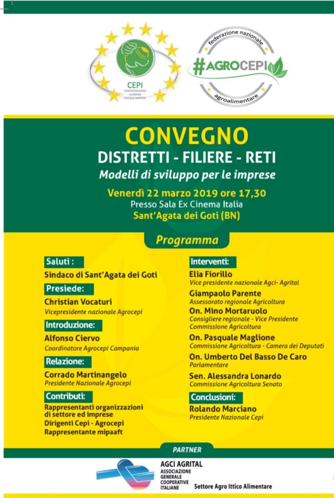 Agrocepi Federazione Nazionale Agroalimentare unitamente a Cepi ( Confederazione Europea per le piccole e medie Imprese), intendono promuovere a Sant’Agata dei Goti (BN) per Venerdì 22 Marzo alle ore 17,30 presso la Sala ex-Cinema Italia, un Convegno utile al confronto con tutti i soggetti istituzionali, per favorire nuovi modelli di sviluppo per l’agroalimentare e per aggregare le produzioni, premessa essenziale per veicolarle nella distribuzione e nella commercializzazione.