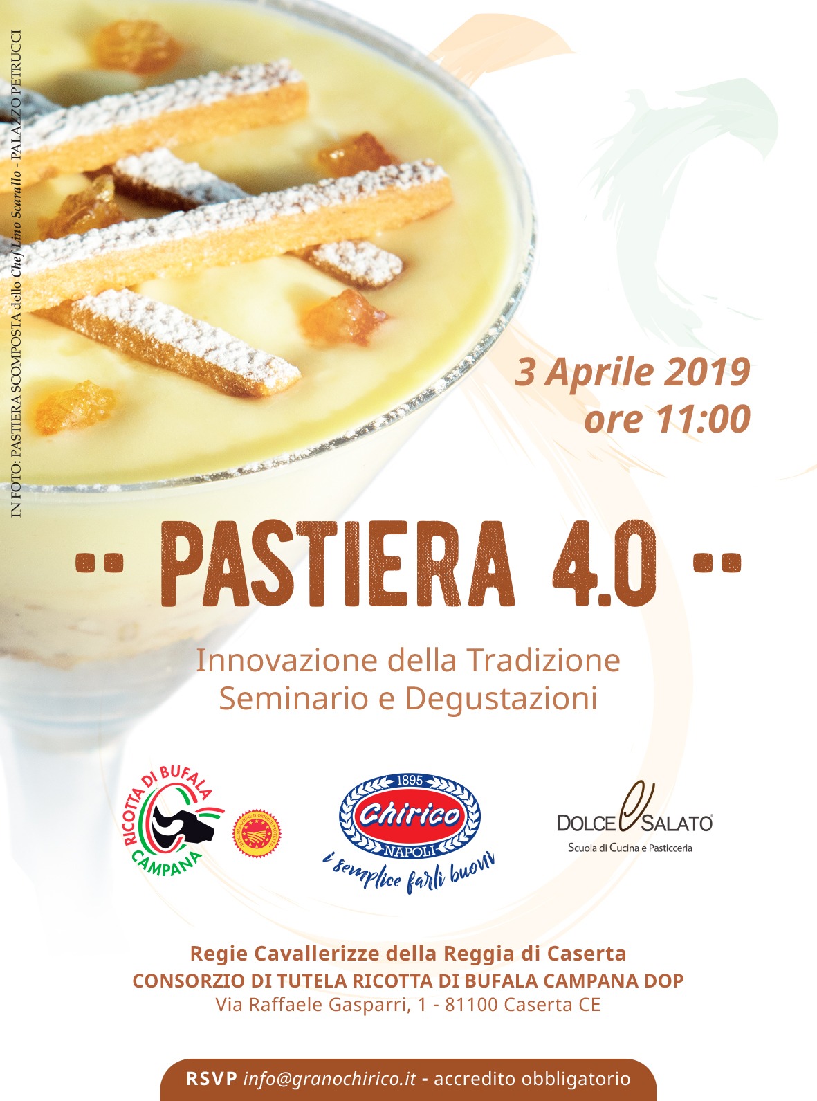 Questo ambizioso progetto lanciato dal Consorzio Ricotta di Bufala Campana DOP, ha giustamente coinvolto l’azienda Chirico, eccellenza del grano cotto da sempre abbinato alla pastiera e non solo, a partecipare con l’altro ingrediente portante della pastiera e invitandolo ad essere così partner di un innovativo quanto mediatico esperimento in una location d’eccezione. Sarà la spettacolare Reggia di Caserta, la residenza reale più grande al mondo, e precisamente le Regie Cavallerizze sede del Consorzio Ricotta di Bufala DOP ad ospitare dunque la prima edizione di Pastiera 4.0 con il coordinamento de La Scuola di Alta Formazione Dolce & Salato dello Chef Giuseppe Daddio che ha coinvolto 8 Chef di Pasticceria a realizzare le loro personali rivisitazioni della pastiera, e che parteciperanno il 3 aprile per presentare il proprio prodotto esaltandone gli ingredienti utilizzati. Gli chef presenti all’evento sono: Antonio Angora, Salvatore Tortora, Marco Aliberti, Mario Di Costanzo, Michele Cappiello, Vincenzo Faella, Gennaro Peluso, Raimondo Esposito.