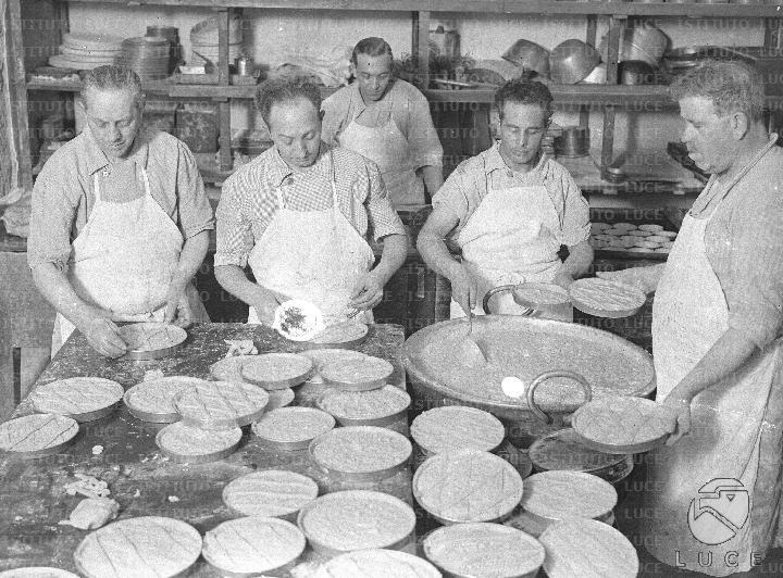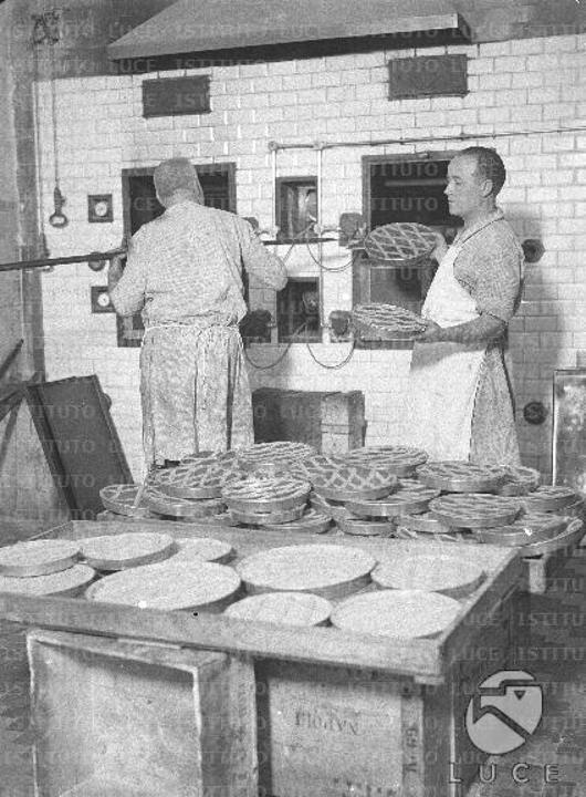 Altra bella testimonianza è quella fotografica che troviamo nell’Archivio dell’Istituto Luce, grazie al Fondo Amoroso, prodigo di scatti nella Campania agricola degli anni ’30 del novecento. La foto dell’aprile del 1939 a Napoli evidenzia anche il panorama estremamente maschile del mondo della pasticceria del tempo…ma soprattutto la forma mai mutata ed attualissima del dolce con il grande contenitore per il grano cotto protagonista delle cucine, con forni a legna, in grado di sfornarne quantità elevate nei febbrili giorni che precedevano Pasqua.