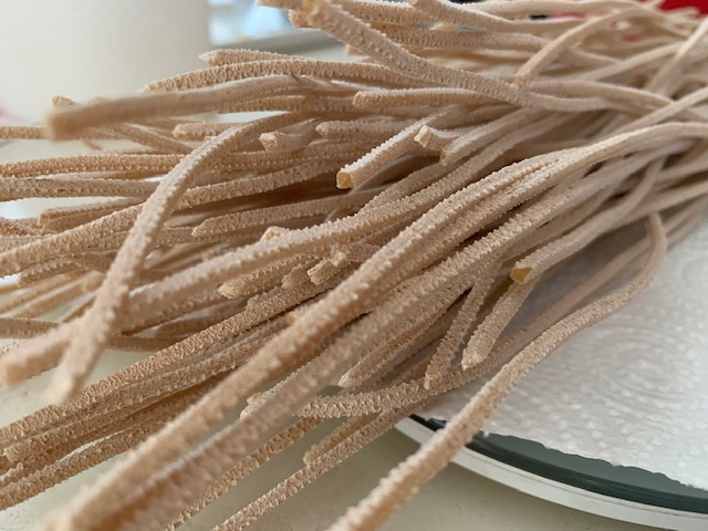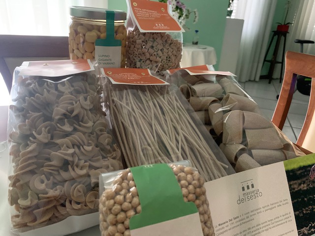 Ma qui nuovi prodotti fanno sempre capolino, si continua nel dare una mano alla difficile coltivazione del Cece di Teano, ultimo arrivato tra i Presidi Slow Food, si prova a ripiantare il fagiolo Piattella di Calvi Risorta, si confida molto ed a ragione nella coltivazione del Grano Senatore Cappelli, ottenuto in rotazione agraria dei terreni del lupino, quindi, pure per questo, un sapore che unico anche tra le paste con questo tipo di grano da cui ormai, a prezzo giusto si ricavano tanti formati di pasta trafilata a bronzo da farina macinata a pietra, capaci di soddisfare la creatività di chef o le necessità di una dieta casalinga che non vuole rinunciare al gusto. Delle prime produzioni già ne parlammo qualche mese fa, ora constatiamo il successo e la differenziazione dei formati con magnifici spaghettoni quadrati, fusilloni, tubetti.