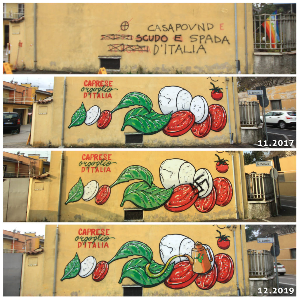 Perché hai scelto il “cibo” come antidoto all’odio? “Perché in fondo il cibo siamo noi, la nostra tradizione e la nostra storia.” risponde lo street artist “Per noi italiani il cibo è qualcosa di sacro. A cena guardiamo programmi di cucina e allo stesso tempo parliamo di cosa mangeremo il giorno dopo. Il cibo, in particolare il caffè, rappresenta anche il principale momento di unione e di condivisione e si presta benissimo a simbolismi e metafore. Per esempio, la cucina come la conosciamo oggi non esisterebbe se non fosse per i flussi migratori che si sono susseguiti nelle ere e molti degli ingredienti che consideriamo sinonimo d’italianità in realtà italiani non sono neanche un po’. Pensiamo a una caprese: pomodoro, mozzarella, basilico e un filo d’olio. Non solo ha i colori della bandiera italiana ma è diventata il simbolo dell’italianità in tutto il mondo, al pari della pizza. Bene, il pomodoro è originario della Colombia, il basilico dell’India, la mozzarella dell’Italia e l’olio della Siria