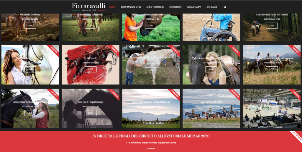Dopo l’annullamento della 122^ edizione della manifestazione fisica, dovuto all’inasprimento delle restrizioni per la crescente emergenza sanitaria, l’appuntamento con il mondo equestre si è trasformato: quattro giorni digitali – dal 5 all’8 novembre – hanno animato il sito web e i canali social ufficiali di Fieracavalli, con oltre 55mila visualizzazioni sul sito e sui canali ufficiali della community. Un fitto programma di contenuti che ha dato vita ad un vero e proprio Equestrian Hub: talk in diretta, interviste e contenuti on demand per la community di Fieracavalli. Quindici appuntamenti in live streaming dedicati all’approfondimento di tematiche da sempre centrali per la manifestazione.
