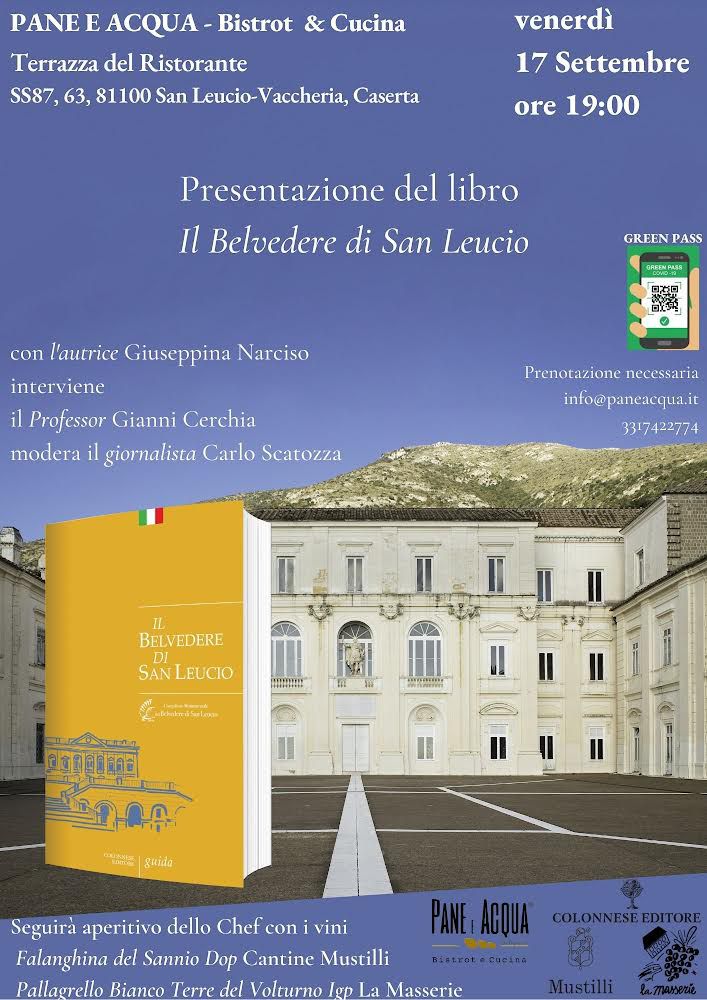 Si presenta venerdì 17 Settembre alle ore 19:00 presso la Terrazza del ristorante PANE e ACQUA – Bistrot & Cucina (SS87,63,81100 San Leucio – Vaccheria, Caserta), la Guida del Belvedere di San Leucio, edita da Colonnese Editore.