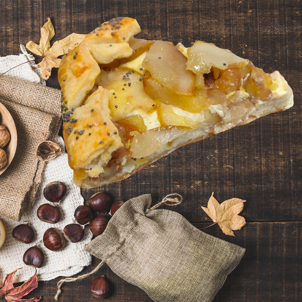 Come una cheesecake salata con castagne, pere, formaggio, ricotta e foglie di alloro.