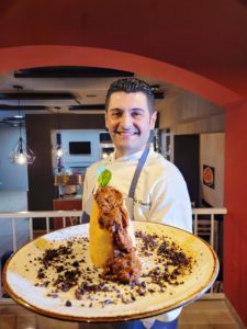 Si termina il percorso pizza con Genovesuviana con salsa di cipolla sfumata al vino Catalanesca, stracotto di manzo preparato con spezzatino di manzo (selezione Bifulco) brodo vegetale e aromi naturali di tradizione campana, fior di latte e tocchetti di patate con buccia stufate al forno con birra rossa e rosmarino fresco. Guarnito all’uscita dal forno con fonduta di Parmigiano Reggiano Dop stagionato 30 e olio evo del Vesuvio In abbinamento l’ottimo Trocla Lacryma Christi Doc del Vesuvio rosso 2020 di Cantina Monte Somma Vesuvio.