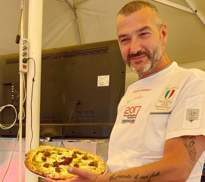 Crema di fririelli, polpettine di carne di scottona, provola di Agerola, peperoncino crusco e un ingrediente segreto, ecco i sapori esplosivi della “Curniciella”, pizza special gold della famiglia Vesi, che come ogni edizione rinnova la sua propensione a stupire i visitatori del pizza Village con effetti speciali. e con una creazione ad hoc.