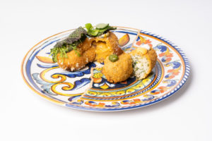 Nella prova fritto “base riso” Pasquale Petrillo ha portato un “Arancino al Prunet e Bettelmatt” con Riso carnaroli, brodo di carne, scalogno, Prunet, Bettelmatt, burro e timo.