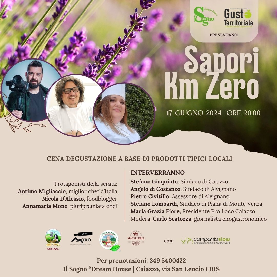 Lunedì 17 giugno, alle ore 20.00, presso “Il Sogno — Dream House” di Caiazzo (CE) in via San Leucio I BIS, si terrà un evento coinvolgente dedicato agli amanti dell’ottima cucina, dal titolo Sapori a km 0. Organizzata in collaborazione con l’associazione enogastronomica “Gusto Territoriale”, questa serata sarà un’occasione unica per degustare prodotti tipici del territorio e incontrare alcuni dei protagonisti più influenti del panorama culinario locale e nazionale. La degustazione sarà preceduta anche da un approfondimento moderato dal nostro Carlo Scatozza, cui parteciperanno i sindaci di Caiazzo Stefano Giaquinto, di Alvignano Angelo di Costanzo insieme all’assessore Civitillo, il sindaco di Piana di Monte Verna Stefano Lombardi, la Presidente della Pro Loco di Caiazzo Maria Fiore. L’evento vedrà la partecipazione speciale dello chef Antimo Migliaccio, premiato come “miglior chef d’Italia 2023”, comparto cucina tradizionale, nel format di Sky Tv Il Miglior Chef d’Italia. Noto per la sua abilità nel reinterpretare la cucina tradizionale con un tocco innovativo, sarà insieme a lui, il foodblogger Nicola D’Alessio condividerà la sua passione per la gastronomia, accompagnato da numerosi altri ospiti illustri, non solo della cucina campana ma anche di quella nazionale.