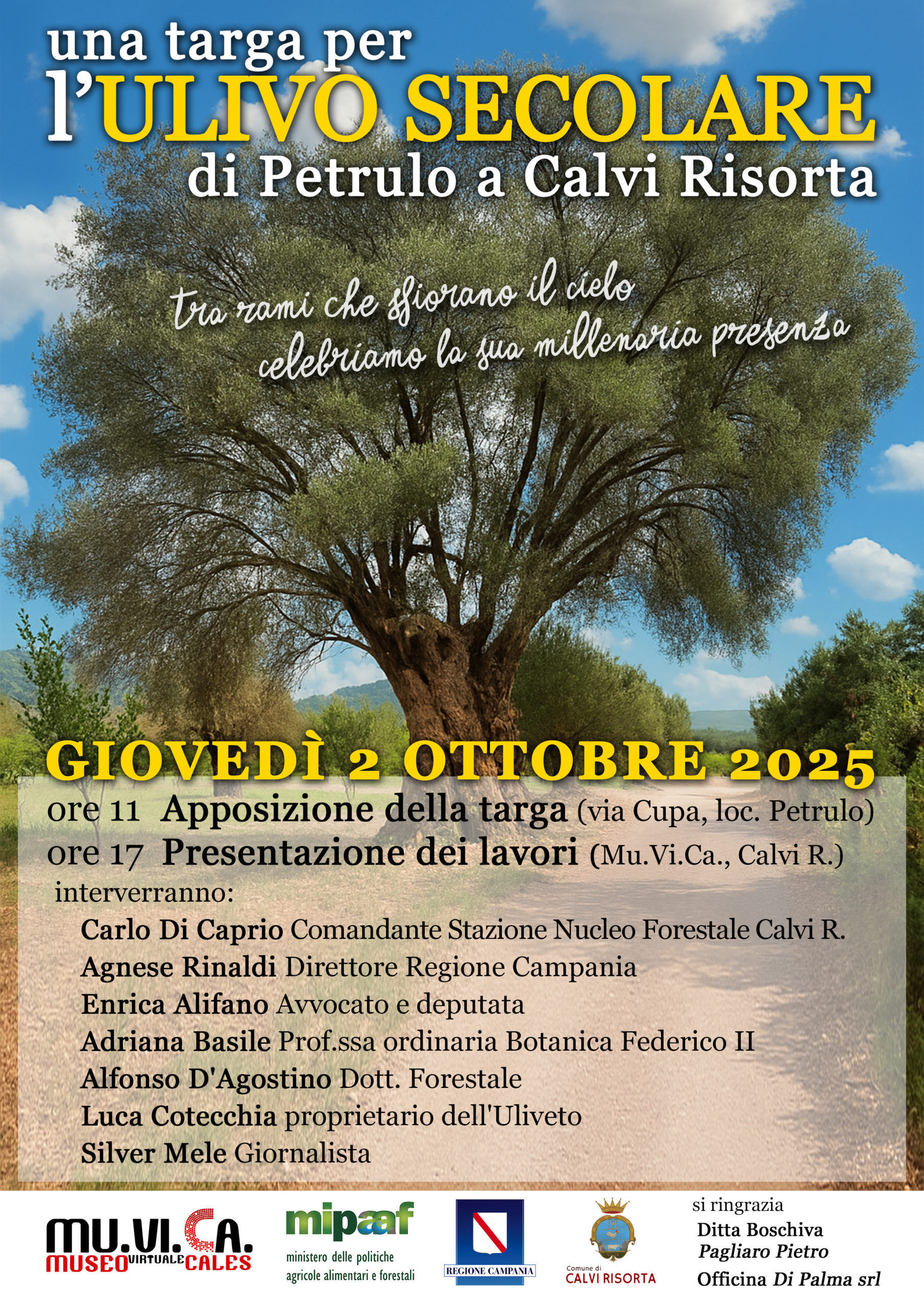 Un patrimonio vivente del territorio caleno sarà finalmente celebrato e valorizzato. Giovedì 2 ottobre 2025 l’antico ulivo secolare di via Cupa, località Petrulo a Calvi Risorta – con i suoi 9 metri di circonferenza alla base e oltre 20 metri di altezza, stimato più di 700 anni – riceverà una targa commemorativa che ne riconosce il valore storico, ambientale e paesaggistico.