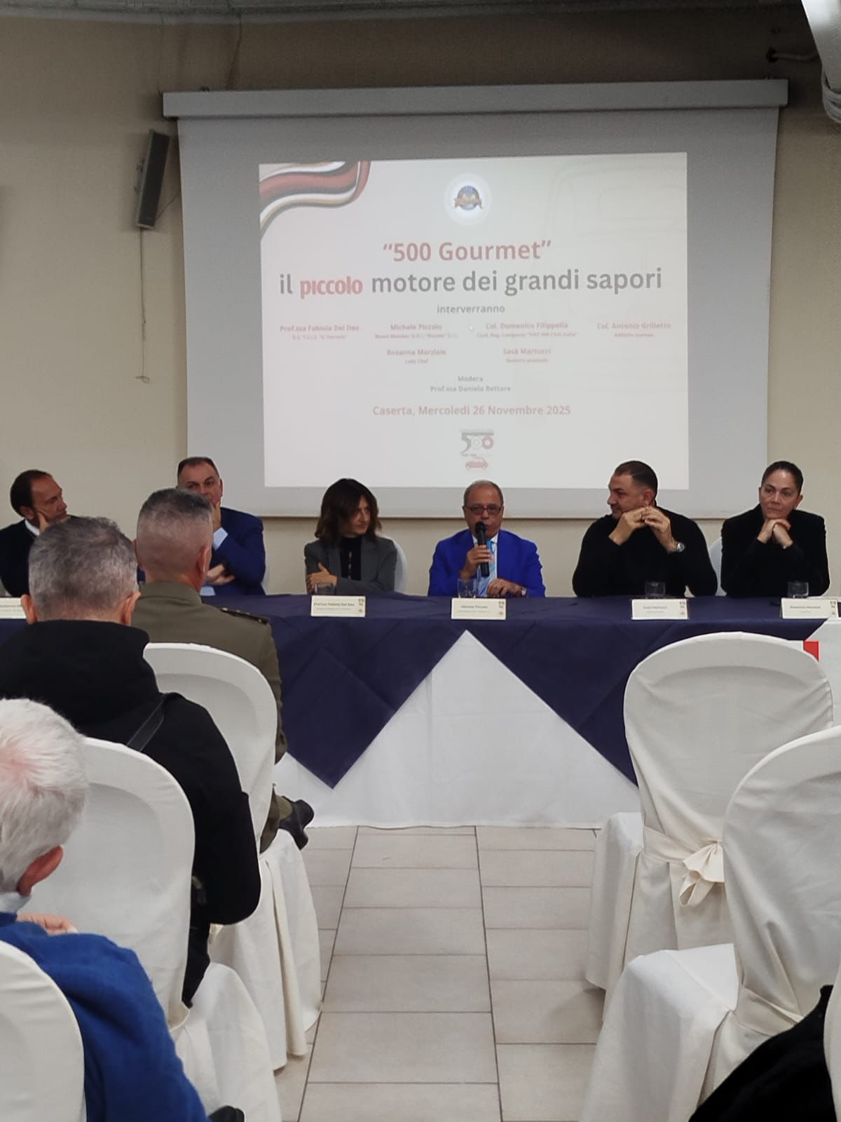 Si è svolta questa mattina, presso la sala convegni dell’ISIS “Galileo Ferraris” di Caserta, la conferenza stampa di presentazione dell’evento “500 Gourmet – Il piccolo motore dei grandi sapori”, iniziativa nata in seguito a un incontro avvenuto durante la maratona Flik Flok, organizzata dalla Brigata Garibaldi dal Colonnello Di Palo.