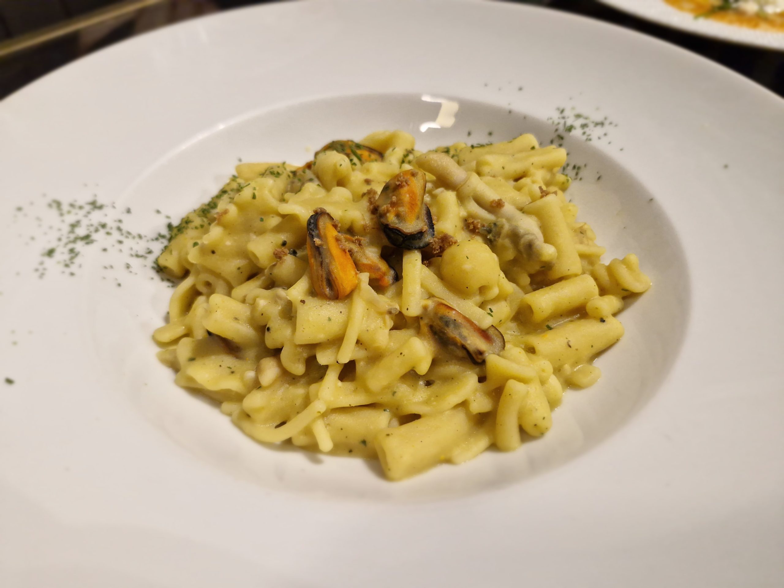 Assaggio di primi con Pasta mista con crema di cicerchie flegree ( leccornia coltivata lungo il lago d’Averno) , frutti di mare ( le cozze bacolesi di.. Bartolo) , gamberi, scampi e bottarga di tonno. poi mezzo zito spezzato con genovese di polpessa ( la polpessa era la preferita dei Purpari storici a Napoli). Abbinamento con Franciacorta Brut 2022 Franciacorta Docg – Bosio