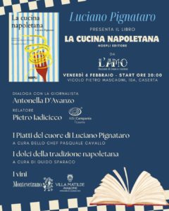 Venerdì 6 febbraio, alle ore 20, il ristorante L’Amo Racconti di Mare di Rosario Rondinone, in vicolo Pietro Mascagni 10 a Caserta, ospiterà la presentazione del volume “La cucina napoletana” (Hoepli) di Luciano Pignataro, giornalista de Il Mattino, tra i più autorevoli comunicatori e divulgatori del giornalismo enogastronomico italiano.