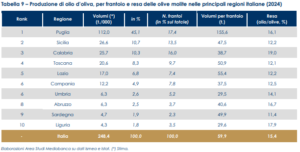 Dal 2014 al 2024 la SAU (Superficie Agricola Utilizzata) nazionale destinata alla coltivazione di olivi si è ridotta del 7,1%. Spicca la Calabria (30,4% della SAU ragionale, -6,7% sul 2014), seguita dalla Puglia (27,3% della SAU, -2,7%). In crescita del 32,4% la SAU coltivata con olivi della Lombardia, che incide poco sul totale regionale (0,3%). La Puglia è la prima regione italiana per produzione di olio d’oliva con il 45,1% del totale nazionale. Completano il podio tricolore la Sicilia (10,7%) e la Calabria (10,3%); seguono Toscana (8,3%) e Lazio (6,8%). Pugliese anche il primato della produzione unitaria: 155,6 tonnellate per frantoio, a fronte di 55,4 tonnellate del Lazio, 50,9 della Toscana e 47,5 della Sicilia; la Calabria si ferma a 38,7 tonnellate (59,9 tonnellate la media nazionale). La resa delle olive (litri di olio ogni 10 Kg di olive, in percentuale) tocca i suoi massimi in Calabria (19%), che precede Liguria (17,9%), Abruzzo (16,7%) e Puglia (16,1%). Campania al sesto posto, ecco il grafico totale