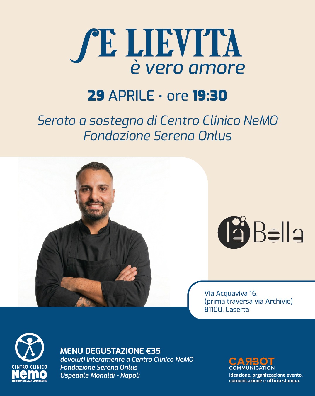 Una serata all’insegna della solidarietà, del gusto e dei valori autentici è il focus di “Se lievita è vero amore”, l’evento benefico che coinvolge il mondo della pizza in iniziative concrete a sostegno della Fondazione Serena Onlus per il Centro Clinico NeMO presso l’Azienda Ospedaliera Specialistica dei Colli – Ospedale Monaldi Napoli. Mercoledì 29 aprile alle ore 19.30 tappa del progetto da La Bolla Caserta con il pizza chef Simone De Gregorio che ha scelto di sostenere il progetto. Interprete appassionato dell’arte bianca, nella sua tecnica artigianale il connubio tra la scuola napoletana e quella casertana, De Gregorio guiderà gli ospiti in un viaggio sensoriale tra lievitazioni perfette, ingredienti selezionati e abbinamenti creativi. Per l’occasione è stato ideato un percorso degustazione in 5 portate (al costo di € 35), pensato per raccontare la filosofia dell’evento attraverso sapori, consistenze e tecniche di lievitazione. Si inizierà con un “Entrée SLAw 66” trancio di pizza in salsa coleslaw, maiale CBT e provola affumicata, si proseguirà con “Oltre la Marinara” un trancio con sala arrostita di pomodori gialli e rossi, acciughe del cantabrico, capperi e aglio Orsino. Ed ancora “Carcio e Pepe” pizza con carciofo brasato ed arrostito, fonduta di pecorino, pepe e porro fritto per finire con “Trancio di mela annurca” in quattro consistenze. Tra le creazioni della serata anche la “Pizza Nemo Terra Sicula”: un impasto studiato nei tempi e nella sensibilità, espressione di una lavorazione attenta e di un’idea di cucina che mette al centro ingredienti selezionati come sugo di melanzane ai quattro pomodori, melanzane marinate, terriccio di pane profumato e ricotta sicula di Bronte. Ad accompagnare il tutto vini della cantine “Le ghiandaie” e “Cantina Alois”. L’intero ricavato della serata sarà devoluto alla Fondazione Serena Onlus, a sostegno del Centro Clinico NeMO presso l’Ospedale Monaldi di Napoli, realtà di riferimento per la cura e l’assistenza delle patologie neuromuscolari.